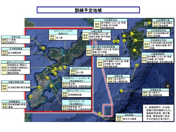 岩国飛行場、相浦駐屯地、目達原駐屯地、高遊原分屯地、霧島演習場、海上自衛隊大 村航空基地、福江空港、航空自衛隊福江島分屯基地着陸場、種子島、奄美大島、那覇基地、出砂島射爆場、伊江島補助飛行場、キャンプ・ハンセン、金武ブルー・・ビーチ等