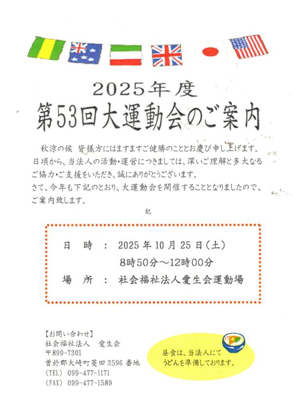 社会福祉法人愛生会(新平金道理事長)の2025年第53回大運動会は、10月25日(土)8時50分~12時00まで、愛成会運動場で開催される。