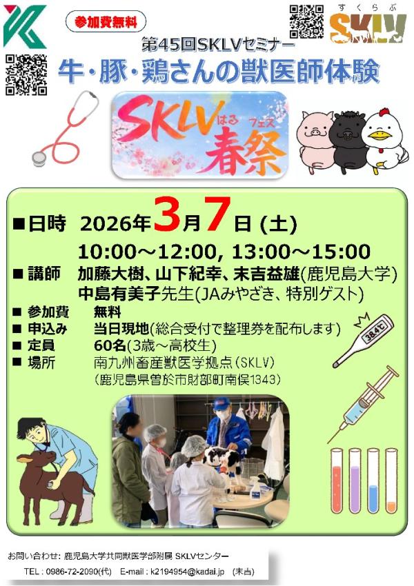 SKLVはるフェス(春祭)は、2026年3月7日、南九州畜産獣医学拠点(SKLV)で開催される。