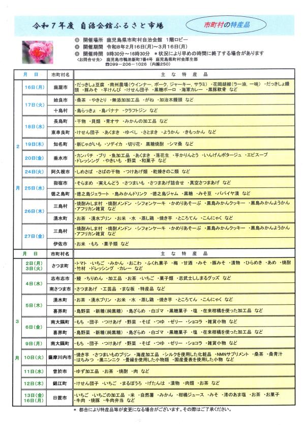 市町村特産品フェア「自治会館ふるさと市場」は、令和8年2月16日(月)~3月16日(月)午前9時30分~午後4時30分、鹿児島市鴨池新町の市町村自治会館1階ロビーで開催される。