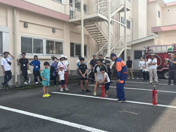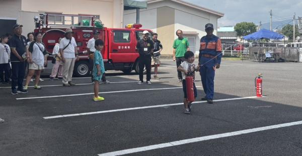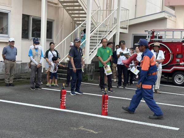 到着後は寿小校区の小学生からお年寄りまで防災体験などの訓練が行われ、鹿屋市安心安全課による講話、消火器を使っての消火訓練、地域子ども食堂と協力して炊き出しなどが行われ、防災食の提供が行われた。