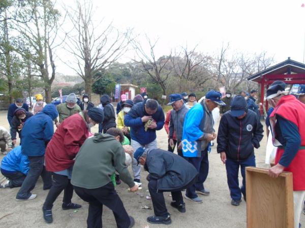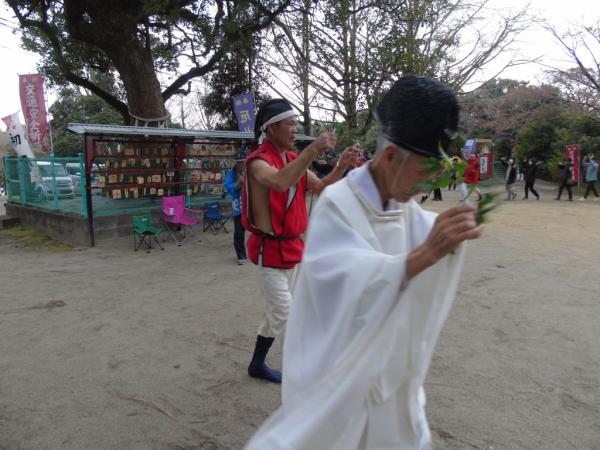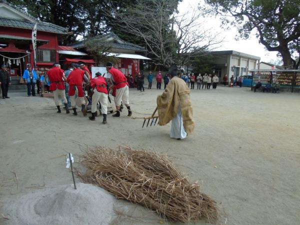 そして「今年も立派な米ができました」と大きな声で観衆に聞こえるように言いながら、昼食のご飯を食べ、太鼓の合図とともに、七人が茅に白砂を包み、観衆を追いかけ、逃げる観衆に白砂を振りかける。白砂をかぶると1年間健康に過ごせると伝えられ、見物人は歓声を上げながら走って逃げ、ありがたく白砂をかぶっていた。
