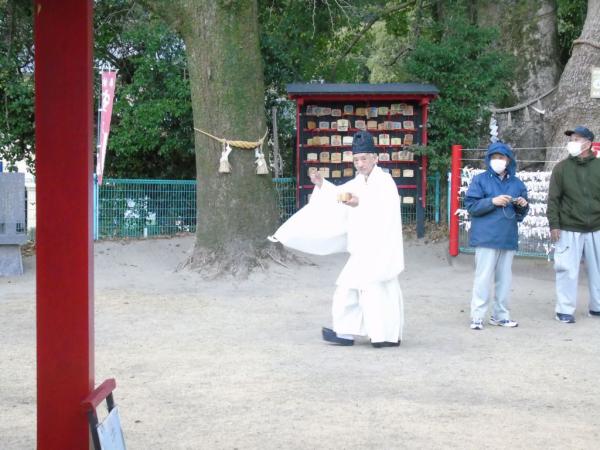 神事が終わると、直径50㌢程度の大きな「鏡餅」を棒に吊して担いだ神官と、牛に引かせて田をならす時に使う「モガ」を担いだ2人の神官が、「オットト オットト」と言いながら、田に見立てた境内を左回りにグルグル回り、宮司が田に種籾を蒔く。