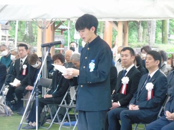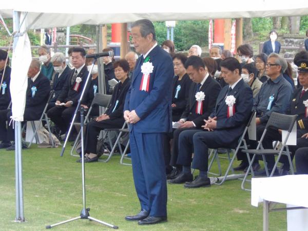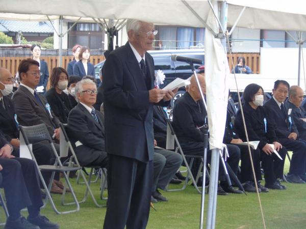 肝付町議会の有留智哉議長、肝付遺族会の西俊一会長が、高山護国神社跡に建立された平和祈念公園建設の経過、遺族会が主体となって行政、民間による支援、多くの尽力、苦労があってこの日を迎えることができたことを含め追悼のことばを述べた。