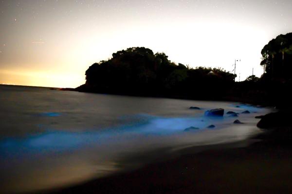 夜光虫(ノクチルカ・シンチランス)はプランクトンの一種で、刺激を受けると青白く光る海洋生物。