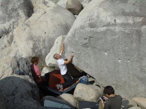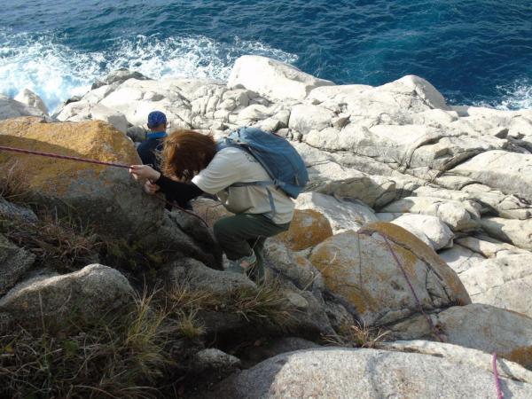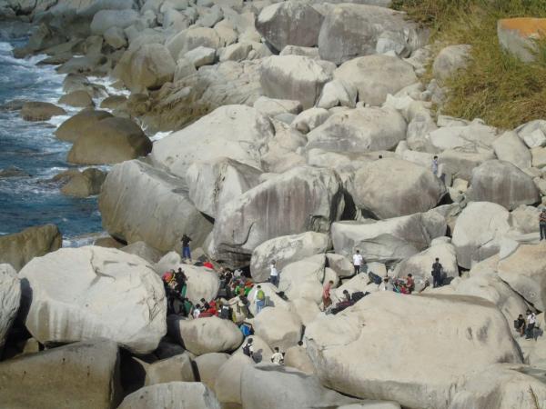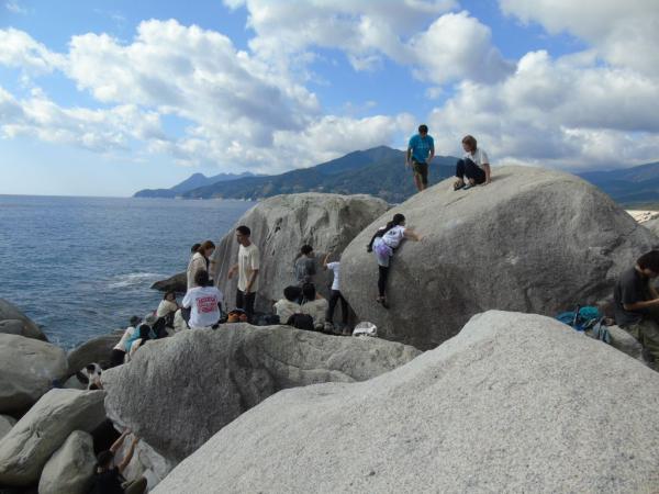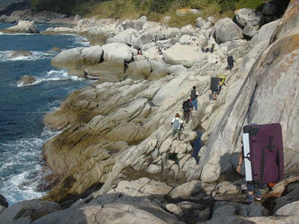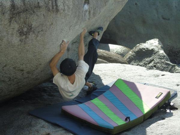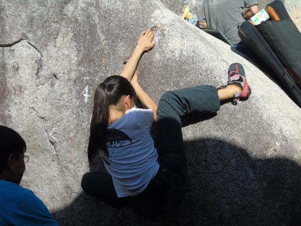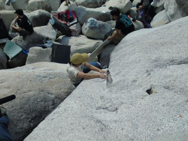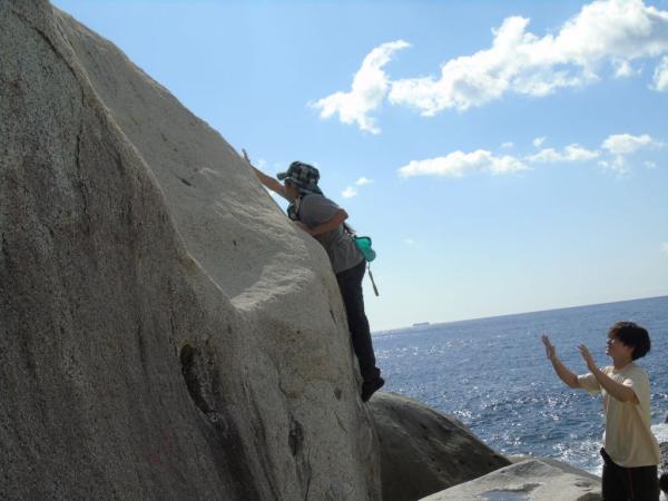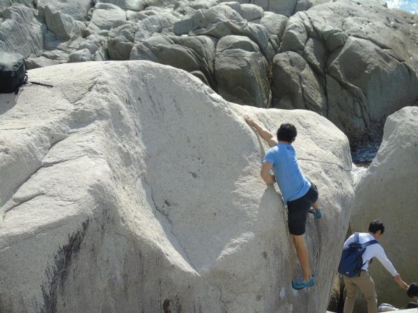 岩にぶつかる波の音を聞きながら、花崗岩の手触りと、岩場に様々なランクのコースが作られ、新しい一手にチャレンジしながら、100人を超えるクライマーが、登った課題の合計得点を競うコンペで競い合った。