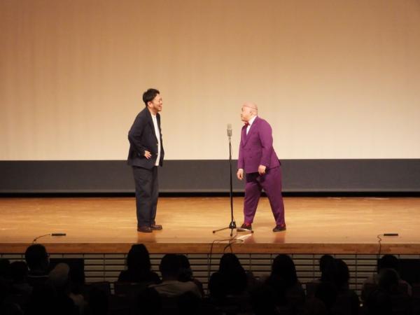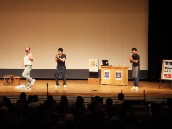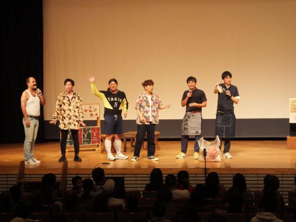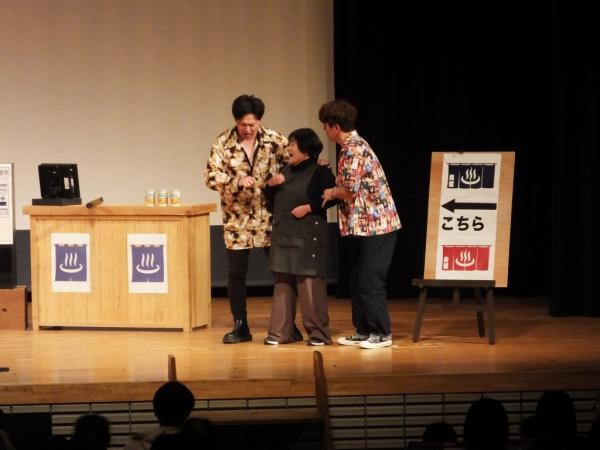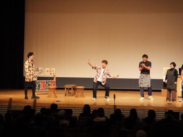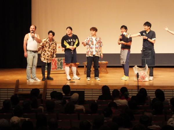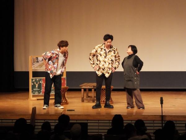 子供漫才もあり、ゲストのそれぞれがお笑いを披露。そしてやぶさめ館を舞台にした芝居では、サプライズゲストとして永野和行町長が出演し、宇宙のまち肝付町をPR。