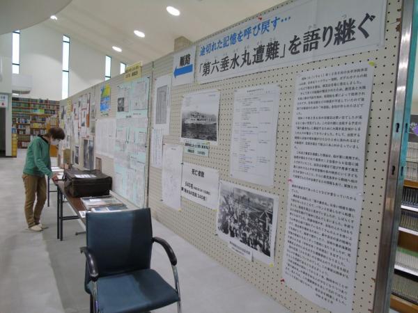 会場となった垂水図書館では、24日日まで『第六垂水丸遭難事故』を語り継ぐ「展示会」も開催され、第6垂水丸遭難事故に関する写真、遺品や新聞記事のほか、紙芝居『65年目の証言』が一部展示された。