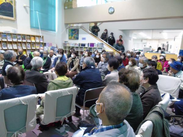 周りに人が集まってわっぜかった。2月で寒い時で、私は連れていかれ風呂に入った。海のほうに戻って、バスに乗って帰ったが、古江坂では木炭バスだったので、裸足で押して坂を上がった覚えがある…など語り、会場からは「何人くらい生き残ったんですか」などの質問もあった。