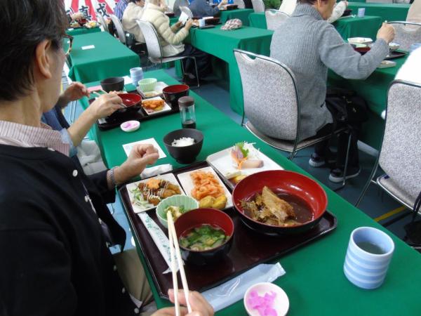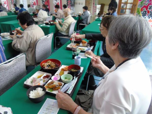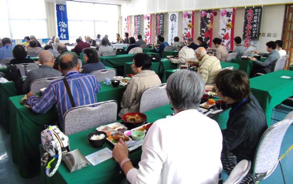 一行は、桜島観光のあと、鹿屋市漁協では、地域住民や鹿屋港大隅観光利用促進協議会会員によるお出迎えがあり、大漁旗で飾られた昼食会場で鹿屋市漁協の皆倉貢組合長らが歓迎のあいさつをし、かのやカンパチ刺身とあら煮、天身から揚げ、ヒメアマエビかき揚げ、ごはんとみそ汁のカンパチづくしコースで昼食。