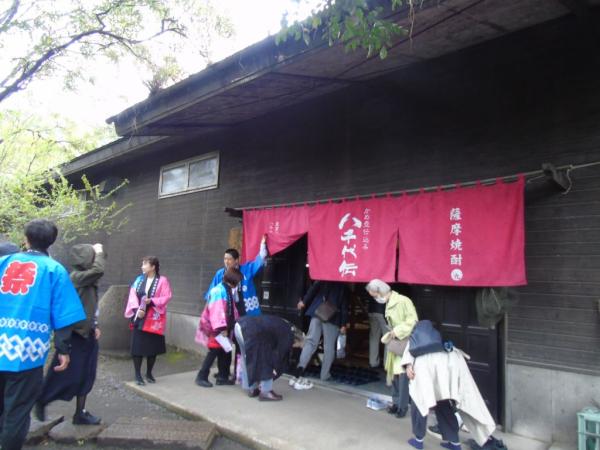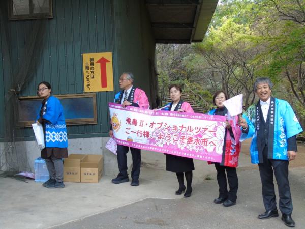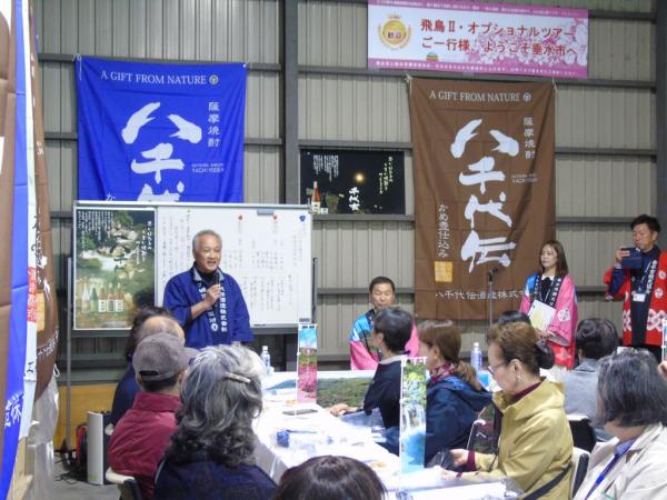 また、千代伝酒造では、垂水市への初めてのクルーズ船ツアーということもあり、垂水市観光協会や垂水市議会議員らがバスを降りるツアー客に横断幕を持ってお出迎え、尾脇雅弥市長らが特産品のプレゼントを手渡し、市長や八千代伝の八木栄寿社長が垂水市の紹介と歓迎のあいさつを行い、焼酎の試飲コーナー、販売もあって、ほろ酔い気分で蔵見学。