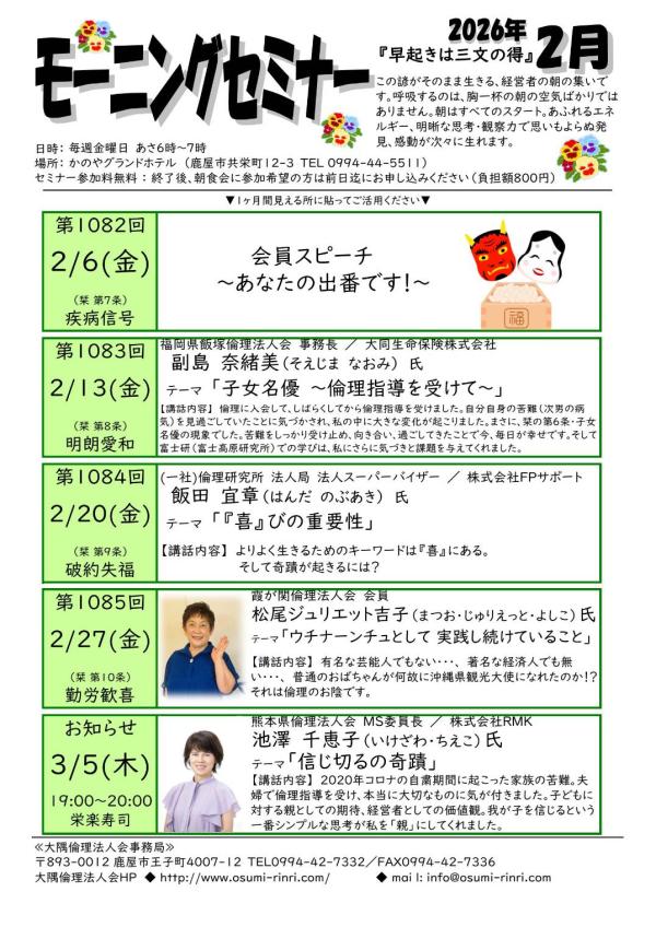 大隅倫理法人会令和8年2月の経営者モーニングセミナーの内容は、次の通り。
