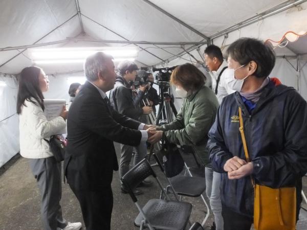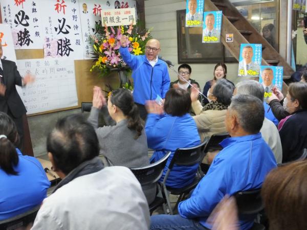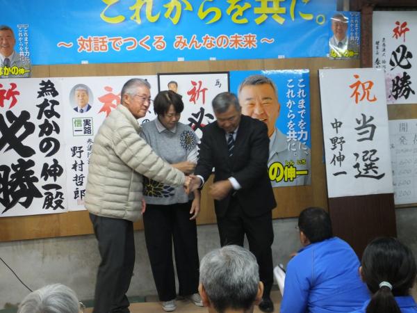 10時45分に中野氏が家族とともに選挙事務所に姿を見せると、割れんばかりの拍手が沸き起こり、新西勝後援会長や東靖弘町長と固い握手。
