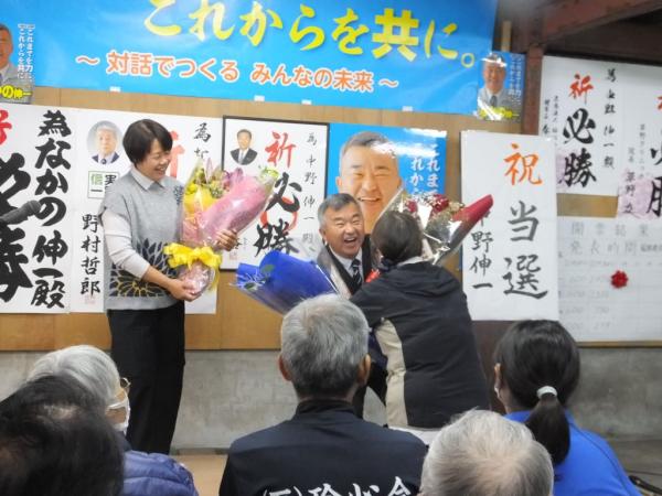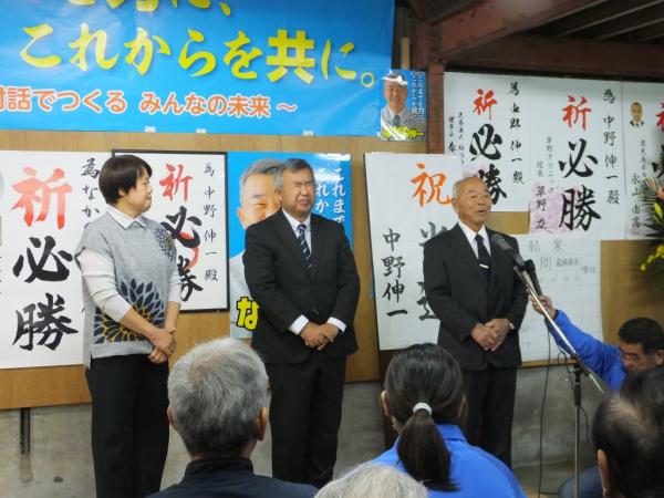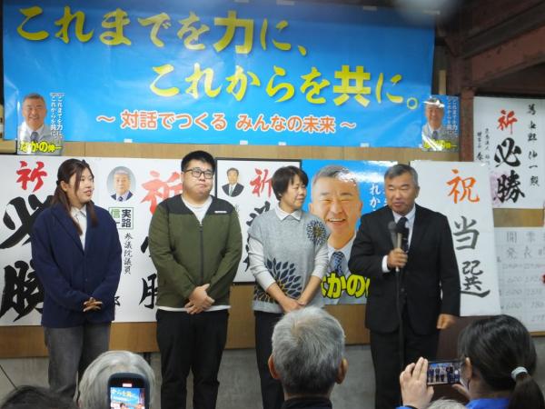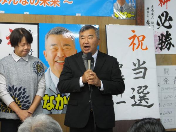 中野氏は「長い選挙戦の中で心が折れそうになったとき、皆さんから叱咤激励、背中を押していただいた。