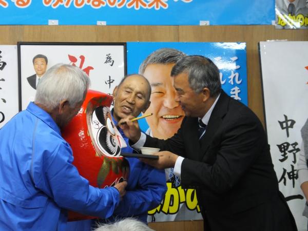 ダルマの目入れがあり、支持者らから花束贈呈があった。