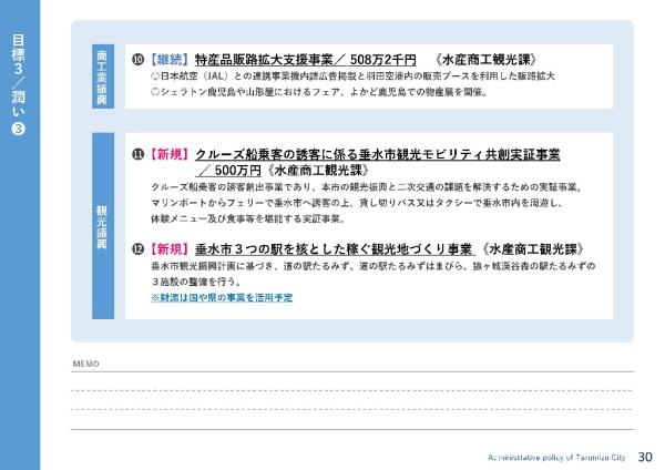垂水市の令和8年度予算案での主要施策、~3つのまちづくりの目標~、③潤いのあるまちづくり主要事業は、クルーズ船乗客の誘客に係る垂水市観光モビリティ共創実証事業(新規・500万円)、錦江湾横断道路推進事業補助金(新規・100万円)事業など別表の通り。