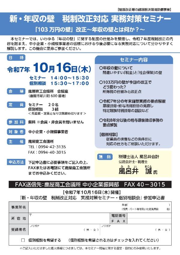 新・年収の壁 税制改正対応 実務対策セミナー「103 万円の壁」改正~年収の壁とは何か?~は、令和7年10月16日(木)、セミナー:14:00~15:30、個別相談:15:30~17:00、鹿屋商工会議所会議室で開催される。