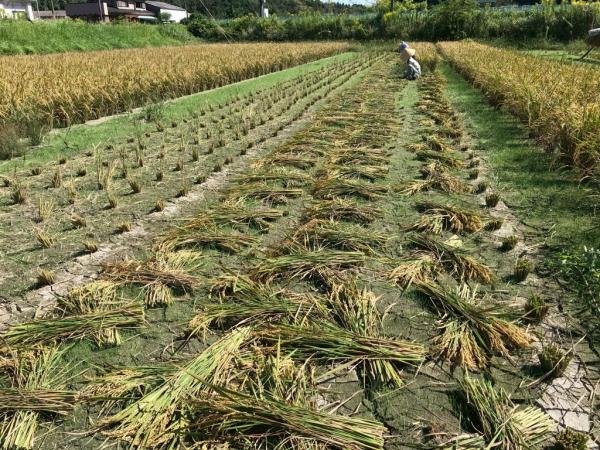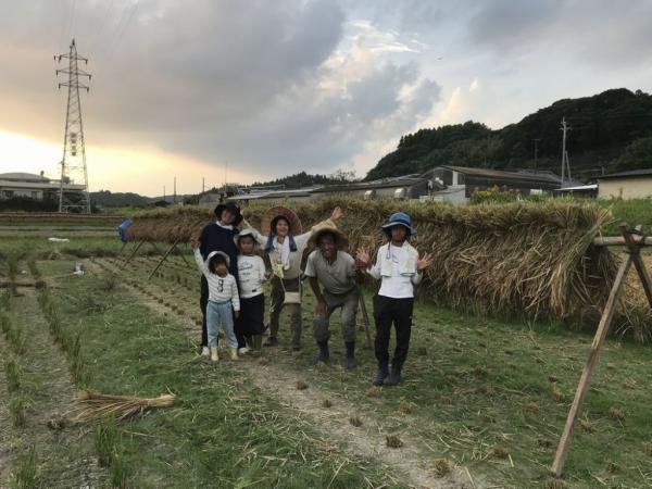 小規模生産者グループ「おおすみ百姓の森」による稲刈りがピークを迎え、家族連れらグループ22組、約50人が各々の田んぼで、それぞれ日程調整をしながら手刈りやバインダーでの稲刈り、掛け干しの作業を行い脱穀を待っている。