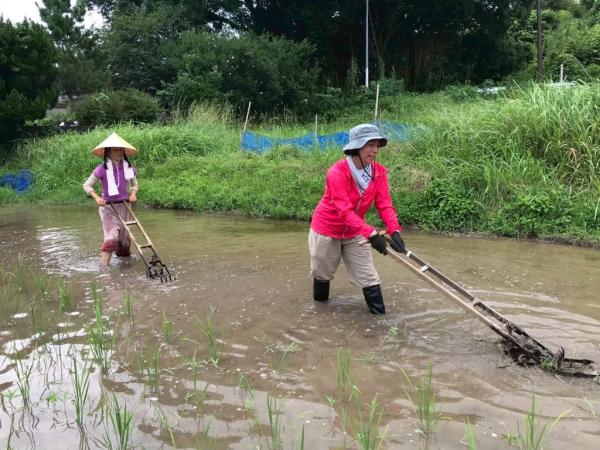 田植え前の田んぼにはレンゲソウを育て、稲苗も、植える田んぼの横に苗床を作り、種籾を1個1個植えて育て、ジャンボタニシなど被害に合わないようある程度大きくなったところで、田んぼに手植えで移植。草刈り機講習なども実施しみんなで力を合わせ田車押し、畦の除草などを行ってきた。