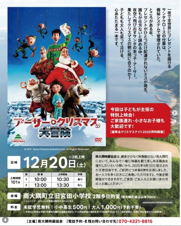南大隅映画協会主催『アーサー・クリスマスの大冒険』上映会は、2025年12月20日(土)10:00開場/10:30上映(字幕あり)、13:00開場/13:30上映(字幕なし)、南大隅町立旧宮田小学校 2階多目的室(南大隅町根占山本7065)で、朝昼2回上映で開催される。