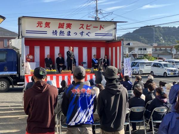 ただ町長一人では何もできない、町民の皆さんが私を押していただき、思いを伝えてもらい知恵をいただき、応援していただく、この錦江町のあたたかい地域が、さらに魅力あるまちへ成長していきますよう、ぜひとも2期目も新田敏郎をよろしくお願いいたします」と力強く決意表明をし、街宣へとスタートした。