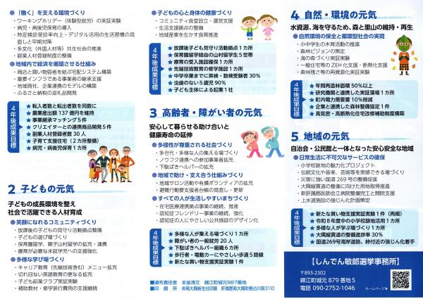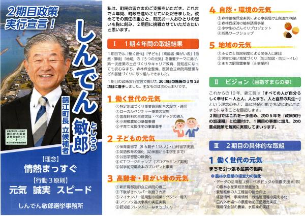 約束しました医師会立病院、県下で2番目に始めた産業支援のための特定地域づくり事業協同組合、子育て支援、産業支援、交流促進、就任早々から働いて、働いて、誠心誠意、粉骨砕身、町政に取り組んできた。