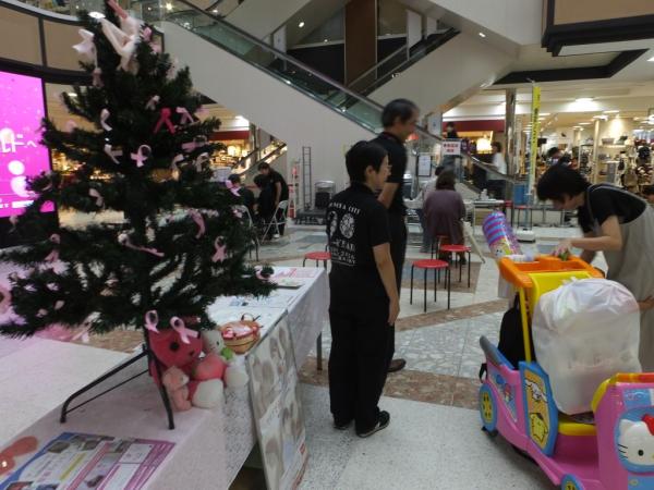 また、買い物客が、ピンクリボンツリーヘの飾りつけも行い、ポケットティッシュなどの啓発グッズが配布されている。