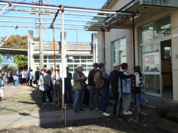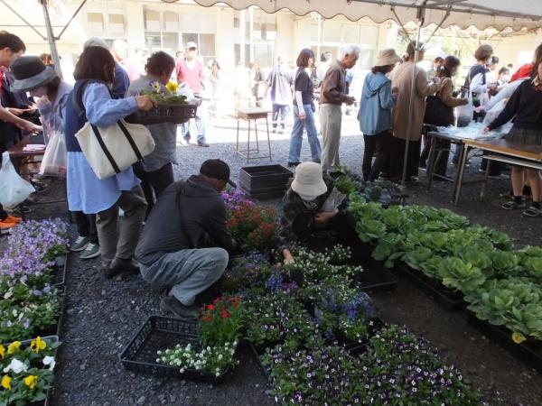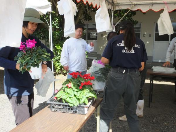 校内の会場には、それぞれ展示や販売をPRするボードを掲げ誘導し行列ができ、新鮮な野菜や花、お肉、加工品などの生産物を販売。