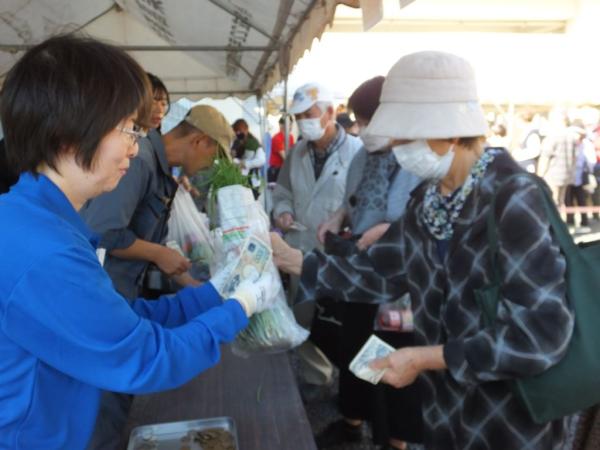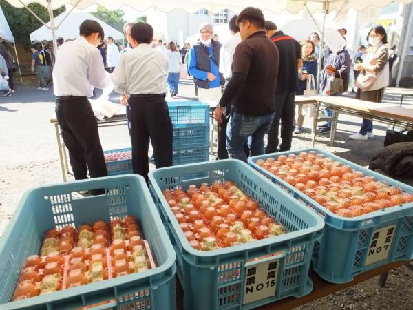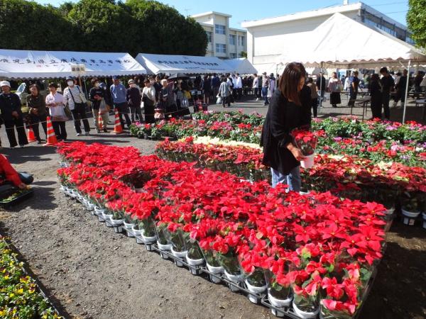 販売開始前の10時から行列ができ、クリスマス前のポインセチアなど色とりどりの花も人気、このほか卵や黒豚味噌、お米などにも行列ができていた。