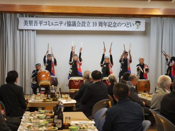 「コミュニティ協議会10年の歩み」がスライド上映され、お祝いの和太鼓演奏があった。