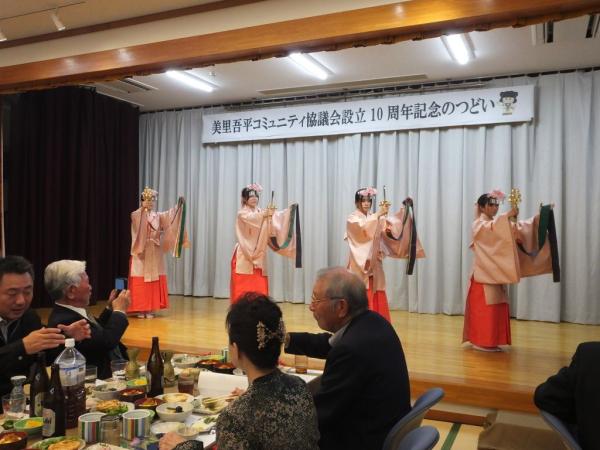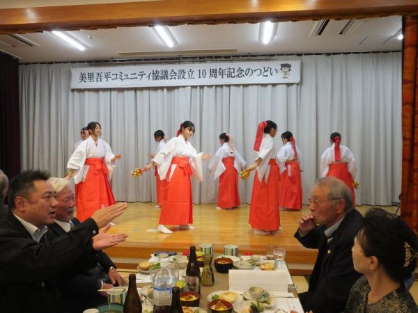 余興では、巫女舞が披露され、それぞれ杯を酌み交わし、料理に舌鼓を打ちながら、今後、地域の歴史を活かした活性化などが語り合われ、親睦を深めた。