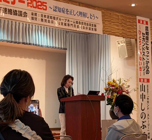 大隅地区認知症セミナー~認知症を正しく理解しよう~が、令和7年11月11日(火)、鹿屋市のホテルさつき苑で開催され、一般社団法人「セカンド・ストーリー」代表 山中しのぶ氏の講演を聴いた。