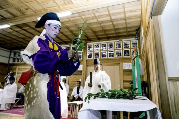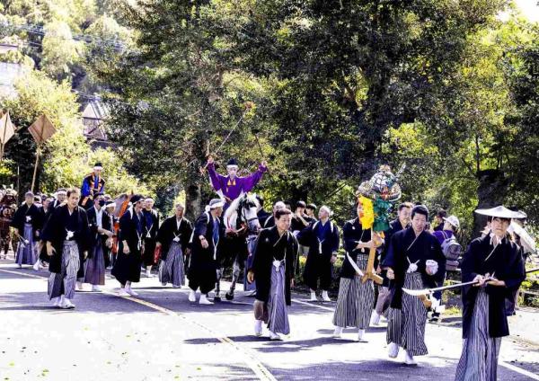 19日は役場から流鏑馬パレードが出発し、市街地をパレードすると神社に帰り、四十九所神社で「弓受けの儀」があった。神殿に保存されている特別の弓を授かり、その時に少年は「神」になった。