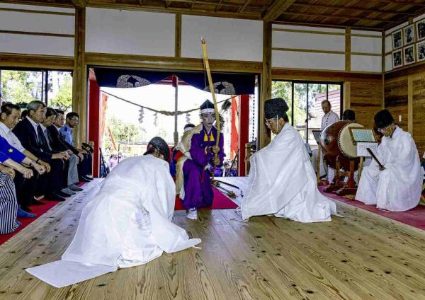 馬場と道具などの清め祓いがあり、大田四十九所神社宮司が安全祈願の祝詞奏上し、射手などが玉串奉奠して、安全を祈願した。