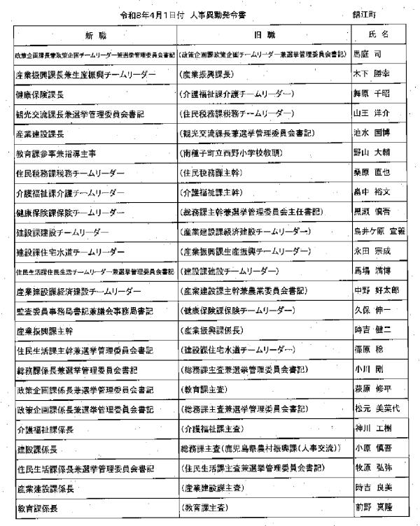 総務課長に浜屋啓子企画課長 東串良町人事異動内示 東串良町は、令和8年4月1日付の人事異動内示を公表した。 総務課長(併)選挙管理委員会書記長に、浜屋啓子企画課長、住民課長に、瀬戸口衛税務課長補佐、企画課長に上野史生総務課長補佐(併)選挙管理委員会書記次長など。 人事異動内容は別表の通り。… …続きを読む ▶